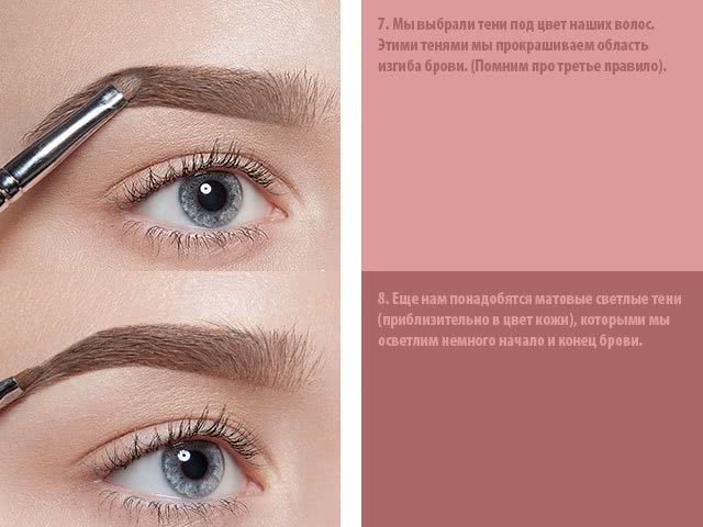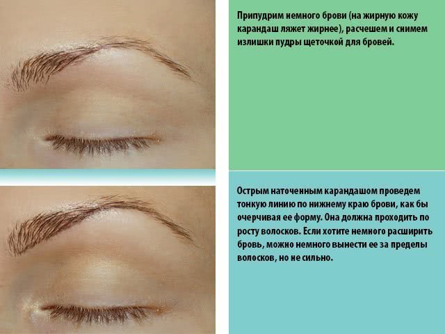 Перед покраской при необходимости делается коррекция формы. Волоски выщипываются, удаляются триммером, воском и т.д. Затемнять волоски можно тенями, если они редкие, после прорисовывать часть волос. Высветляется граница между дугой и веком светлыми тенями или карандашом. Для дуг используются только матовые тени.