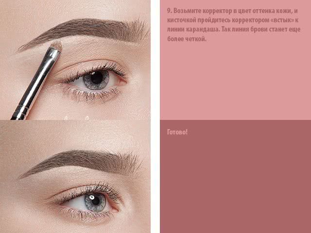 Начните прорисовку с нижней линии. Если хотите их немного приподнять, линия должна начинаться чуть выше, а верхняя обязана чуть выходить за границы (один миллиметр для лица — это очень много, поэтому вполне достаточно) и наоборот. Можно зафиксировать специальным гелем. Заполните все пробелы и тщательно растушуйте щеточкой.