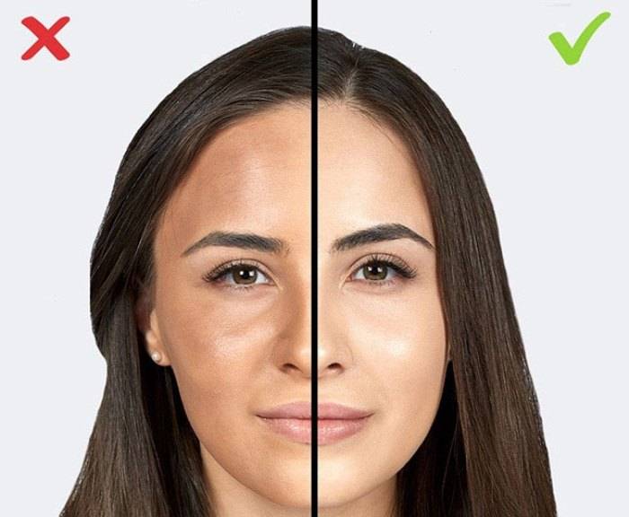 Макияж нужно наносить только при естественном освещении, когда цвет воспринимается адекватно. Искусственная подсветка искажает натуральный тон, поэтому сложно подобрать нужный оттенок. В итоге получится более тёмный или светлый цвет лица, который на фоне цвета шеи будет сильно разиться.