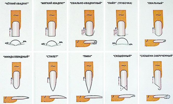 Двух людей с абсолютно одинаковой формой ногтей не существует. Для каждого человека нужен индивидуальный подход в выборе оформления ногтевой пластины, который основывается не только на личных вкусах, предпочтениях, модных веяньях, но зависит от особенностей строения пальцев, всей кисти руки, образа жизни, толщины, состояния ноготков, общего стиля. Есть много вариаций оформления маникюра простые и сложные, к примеру, в моде новинки лета 2015: EDGE, бриджит, паркер. Рассмотрим основные формы ноготков.