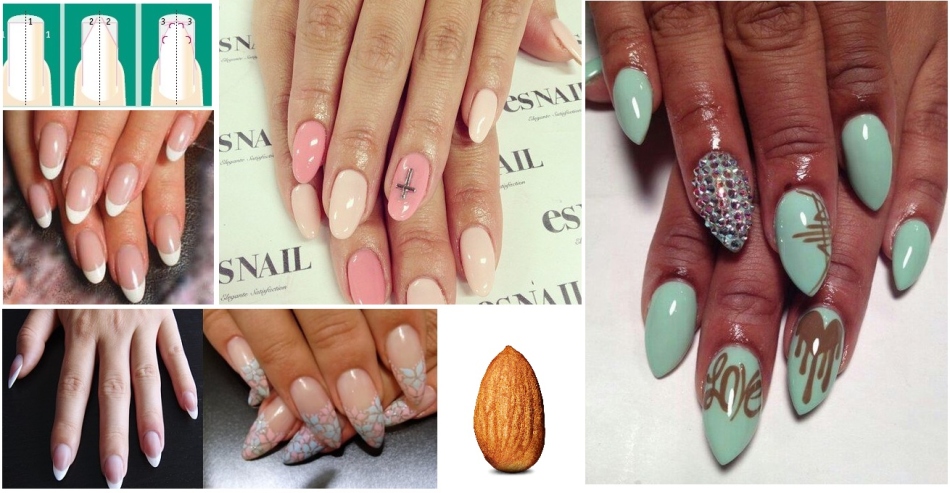Миндальное оформление имеет округлую форму с зауженным кончиком, которое по внешнему виду напоминает миндальный орех. Миндальные ноготки внешне очень похожи на натуральные, рукам и пальчикам они придают утонченный, женственный вид. Но данная форма очень хрупкая, поэтому делать ее рекомендовано на искусственных типсах либо укрепить натуральные ногтевые пластины гелем или акрилом.