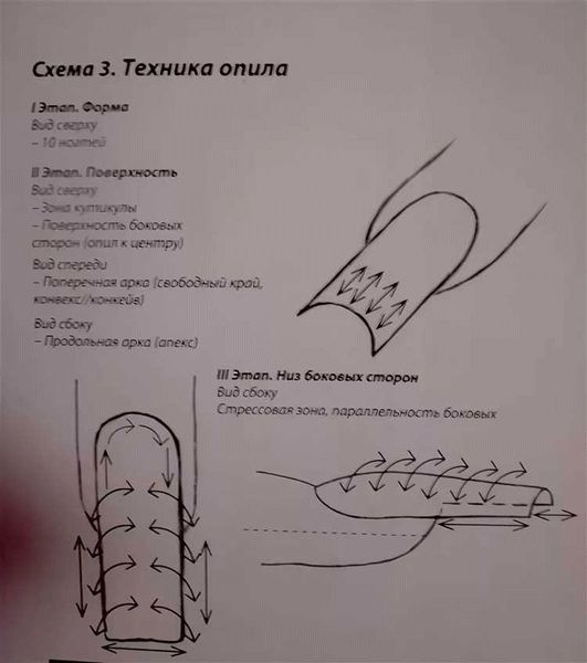 полностью подкладывание пилки под ноготь длинными движениями-завал должен быть под ноготь легкий на 45 градусов-движения елочка
