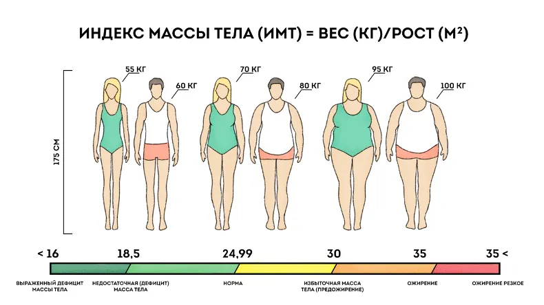 Нормальный вес — это не абстрактное понятие, который каждый может трактовать по-своему. Есть конкретный показатель “индекс массы тела (ИМТ)”, который покажет, действительно ли вы страдаете от лишнего веса, или это скорее комплекс самооценки. ИМТ рассчитывается просто: вес в килограммах нужно разделить на рост в метрах и результат возвести в квадрат. Об избыточном весе свидетельствует ИМТ выше 25, а об ожирении — выше 30.