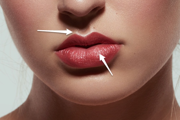 - В-третьих, начинать процедуру необходимо с центра. На верхней губе – с «арки Купидона», бережно двигаясь к уголкам. На нижней – с середины.