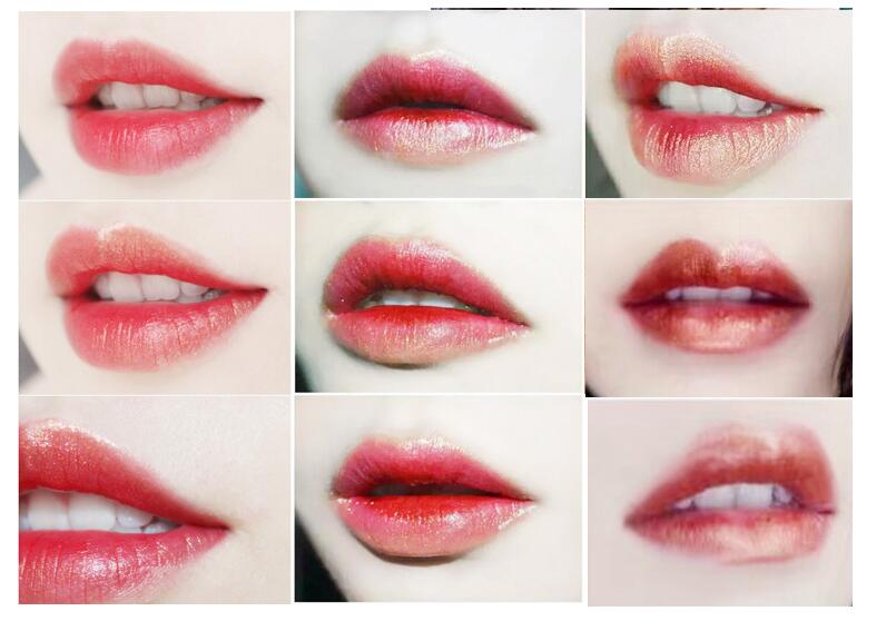 Затем наносится блеск персикового, лёгкого клубничного, или карамельного цвета. Также применяется и бесцветный. В этой технике затемняют середину рта или края. Для контраста берётся две помады: тёмная и светлая.