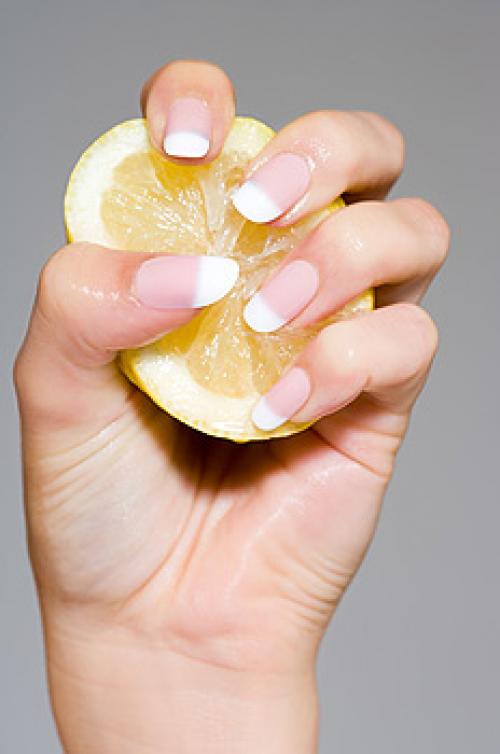 Хорошо укрепляет и отбеливает ногти сок лимона. Пару капель нанесите на каждый ноготочек. Лучше всего процедуру выполнять на ночь. Полезно также втирать в ногтевую пластинку и основание ногтя смесь из равно взятых масляных растворов витаминов Е, A, D, и питательного крема; а также сок клюквы, черной и красной смородины.