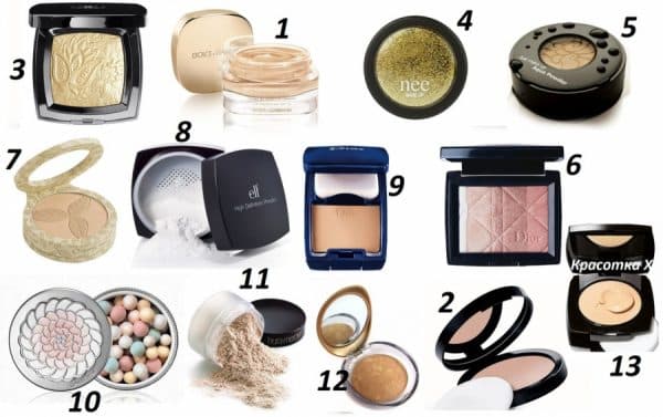 Есть матирующие составы, есть крем-пудры, есть хайлайтеры, пудры с эффектом сияния и т. д.