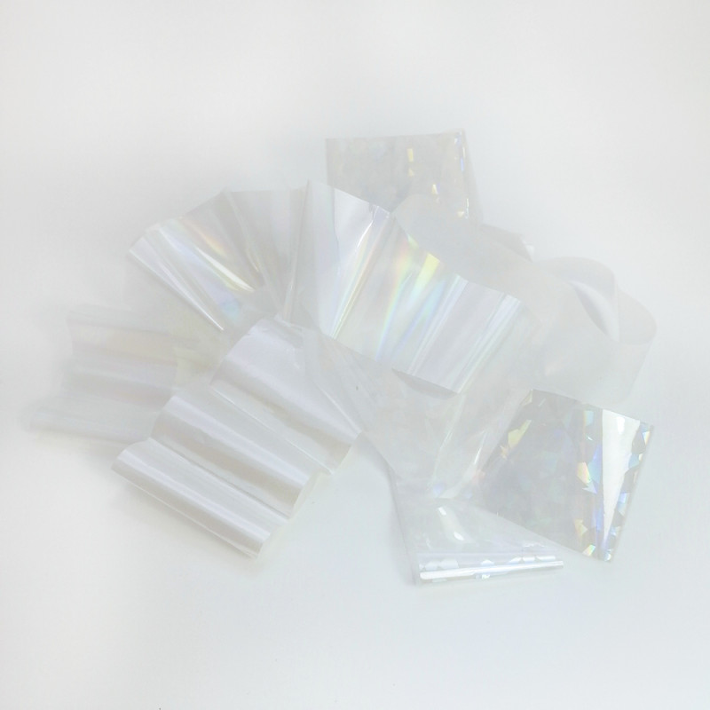 - Предварительно для создания узора в виде осколков битого стекла разрезаем неотрывную фольгу на кусочки. Они должны быть разной формы и размера. Обычно делают треугольники и неправильные ромбы, четырехугольники, трапеции. Чем меньше будут детали, тем лучше они лягут на поверхность ногтя, а сам маникюр будет смотреться более аккуратно.
