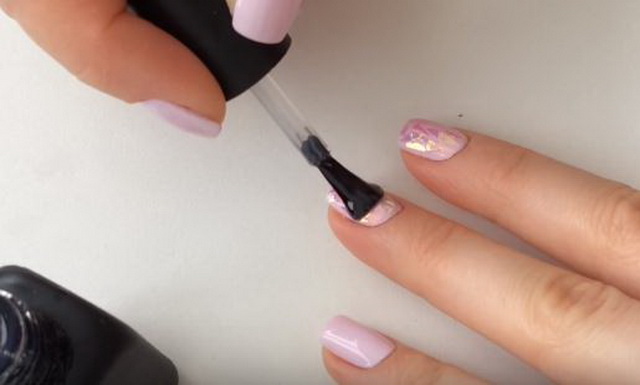 - Подождите несколько минут и нанесите закрепитель. Некоторые лаки делают фольгу менее блестящей, чтобы этого избежать, предварительно поэкспериментируйте на типсах.
