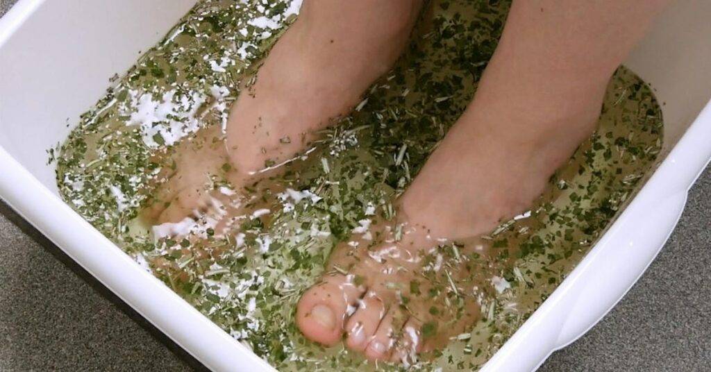 - Опустите ноги в теплый раствор, подержите 25 минут.