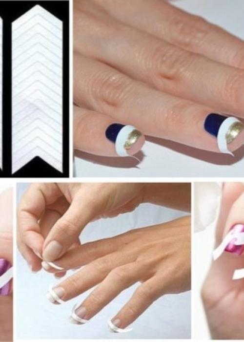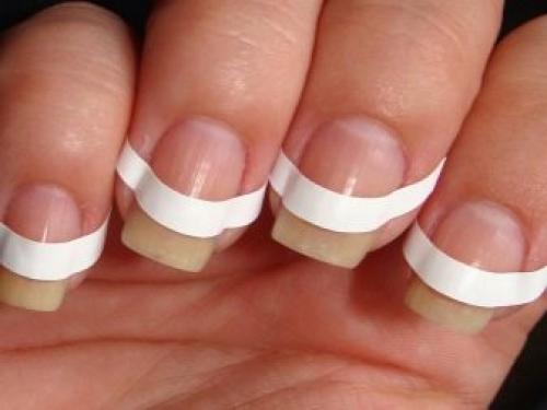 - Необходимо отрезать ровные полоски, обязательно под прямым углом, расположить их углом наверх и приклеить их таким образом к центральной части ногтя. Остается лишь покрыть лаком отросшую часть и дождаться, пока он высохнет.