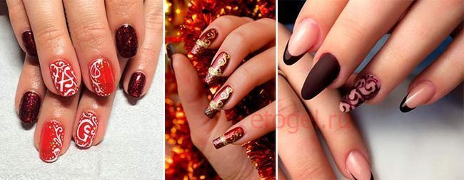 Большой популярностью пользуется маникюр с росписью и удлинением у основания ногтей. Для декорирования нередко применяют блестки, которые украсят и сделают маникюр еще более эффектным, ярким и праздничным.