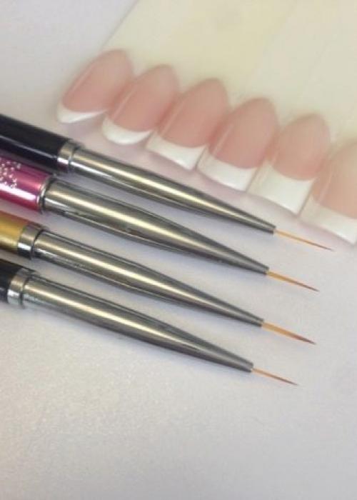 Использование маникюрных кистей при формировании улыбки френча может быть трудным для начинающих. Сложно одинаково ровно выводить линии на всех пальцах, чтобы дизайн смотрелся профессионально. Конечно, можно исхитриться и прибегнуть к фантазийным рисункам, но если нет навыков рисования, смотреться такой маникюр красиво не будет. Чтобы научиться выводить нужные линии, а тем более рисуя себе самой, стоит тренироваться на специальных трафаретах.