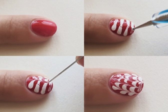 Если лак еще не высох, то стоит воспользоваться капельной техникой нанесения рисунка. На невысушенный лак капают лаком другого цвета и делают растяжку иглой (дотсом, зубочисткой). Потом дают высохнуть и покрывают бесцветным лаком.