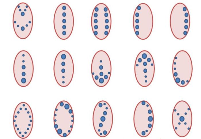 - Размытый рисунок (два контрастных цвета или светлый и тёмный тон одного). Поверх мокрого слоя кисточкой наносят узор (волны, круги, спираль) другим лаком. Зубочисткой корректируются погрешности.