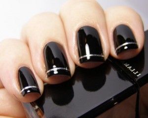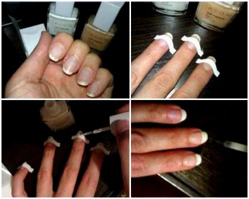 - Необходимо отрезать ровные полоски, обязательно под прямым углом, расположить их углом наверх и приклеить их таким образом к центральной части ногтя. Остается лишь покрыть лаком отросшую часть и дождаться, пока он высохнет.