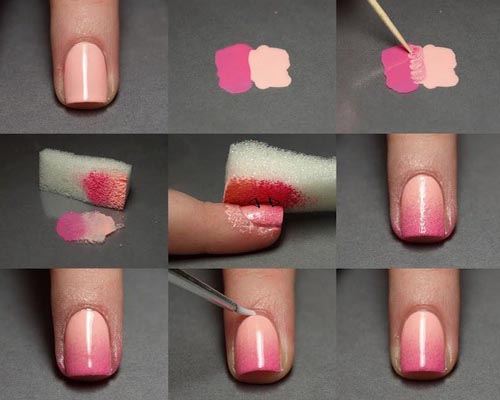 Для создания френча такого вида необходимо выполнить стандартные процедуры – убрать кутикулу, придать форму ногтям, обезжирить пластины, нанести базовое покрытие и смешать на кусочке фольги или тарелочке два вида лака, к примеру, серого и черного цветов в той последовательности, в которой Вы желаете видеть их на своих ноготках. Затем возьмите спонж или небольшой кусочек губки и перенесите лак на ногти постукивающими движениями. Для каждого ноготка готовьте новую смесь лака и не забудьте закрепить итог финишным слоем.