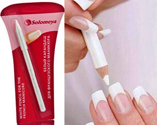 Существует специальный отбеливающий карандаш для французского маникюра, позволяющий очистить от пыли и грязи кончик ногтевой пластины. Стоимость такого карандаша составляет 130-250 рублей, и он с легкостью уместится в любой дамской сумочке или косметичке. При создании френча с использованием карандаша можно использовать только прозрачный лак либо бесцветный лак с небольшими мерцающими частицами. Последовательность действий выглядит следующим образом.