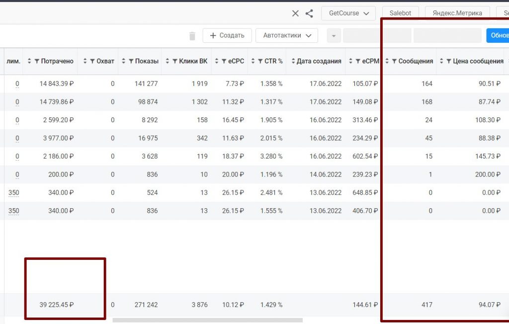 Помогла ей дооформить группу. Рекламу запустили на сообщения. Траты за год с перерывами. Когда у нее было много клиентов, выключала рекламу. Мало – включала. Город на 500 000 человек. 35% всех, кто писал – в итоге пришли и купил услугу.