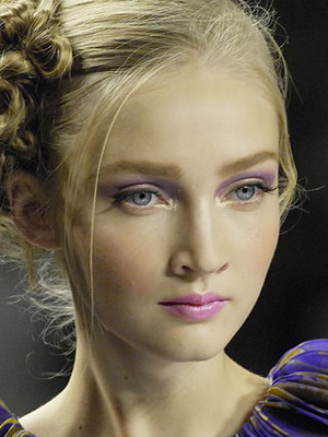 - Светловолосая девочка, блондинка, глаза голубые, светло-синие, серые, кожа светлая и слегка бледновата. Для данного типа внешности подойдет черная или коричневая тушь, бледно-розовая, розовато-белая или розово-бежевая пудра, нежно-розовые румяна. Тени можно взять из сине-серой палитры или подобрать любые необходимые под цвет костюма;