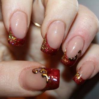 Замечательно выглядит лунный маникюр с сочетанием двух ярких оттенков цвета. Лунный маникюр — не новинка, он известен с 20-х годов ХХ века. Но в последнее время нейл-арт в этом стиле особенно популярен. Его особенность — окрашивание лунки ногтя в отличный от окраски остальной ногтевой пластины цвет. Окрашиваем лунку ногтя лаком золотистого цвета. А остальную часть ногтя, очень аккуратно, при помощи губки, покрываем красным. Финал — нанесение закрепляющего покрытия — и уникальный маникюр, которые по праву можно назвать настоящим нейл-артом, готов.