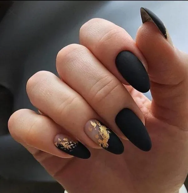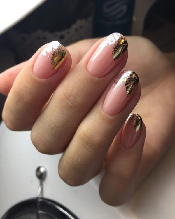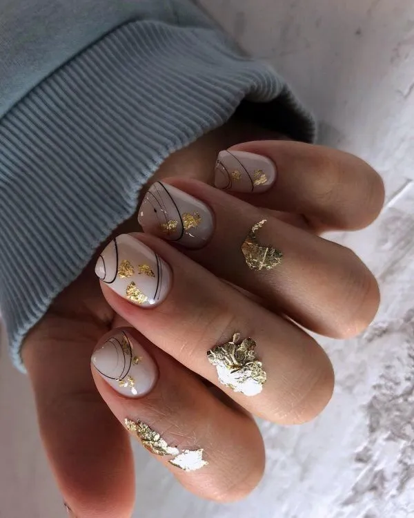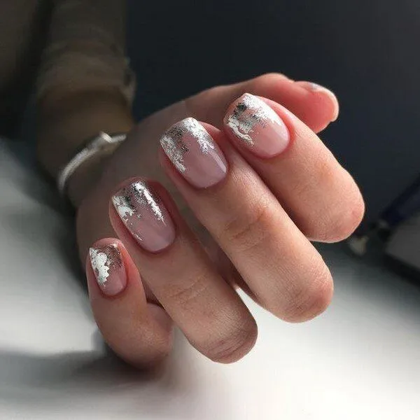 Далее посмотрите на маникюр с серебряно-золотым покрытием, который будет доступен в 2021 году. Этот вариант немного похож на предыдущий, только здесь листы не так симметрично прикреплены к каждому гвоздю. В обоих случаях маникюр выглядит потрясающе.