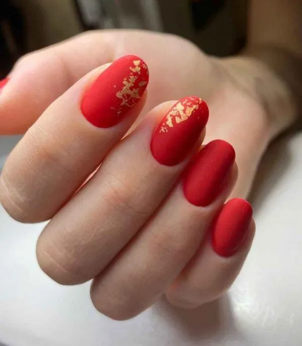 Красный марлевый маникюр выглядит невероятно. В качестве примера мы решили сфотографировать ноготь с красным матовым покрытием. Чтобы не переусердствовать, золотое покрытие наносится только на два ногтя, и результат получается очень сдержанным и изысканным.