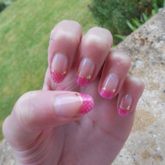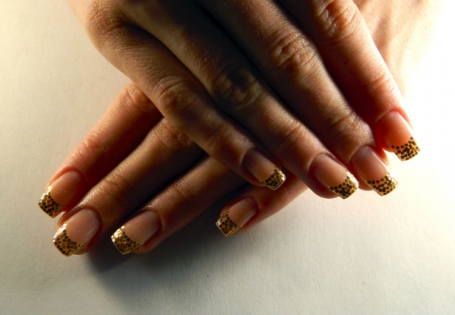 В следующем примере показано, как создать необычный и очень красивый французский язык. Все ногтевые пластины покрыты бледно-розовым лаком. Все края ногтей имеют золотистое покрытие. Если вы ищете продуманную, но яркую дизайнерскую идею, то она перед вами.