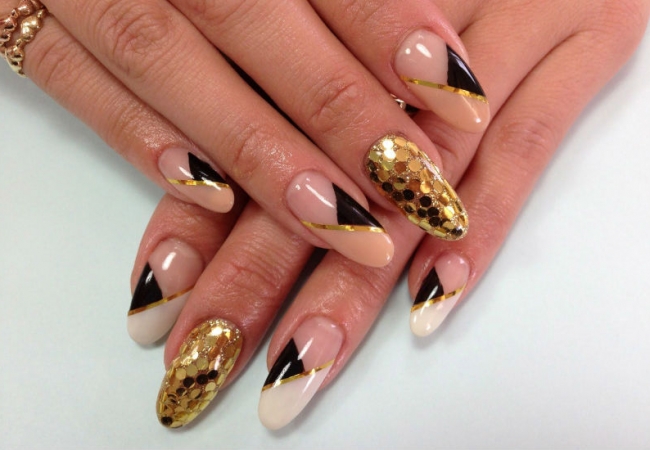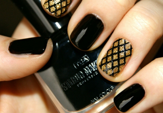 Рассмотрим несколько вариантов нейл — оформления с использованием сочетания: черный — золотой и красный — золотой.