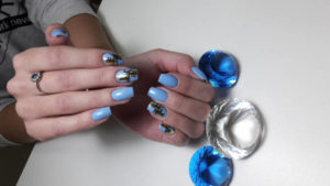 Выполняя данный дизайн, следует быть предельно аккуратными и внимательными. Прежде чем браться за данный дизайн нужно понимать, как работать с поталью. В этом случае подойдет укрепляющая база с липким слоем. На просушенную базу следует аккуратно приложить предварительно вырезанную из потали заготовку, которая должно четко совпадать с размером ногтевой пластины. Никаких зазоров, трещин и неровностей быть не должно.