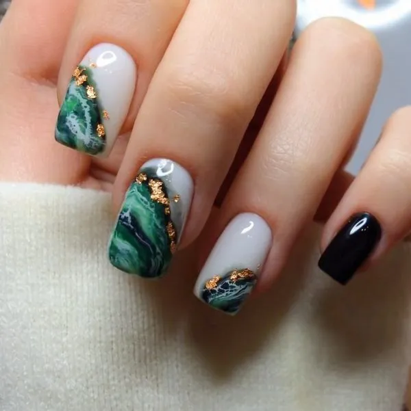Вы хотите чего-то волшебного и магического? Посмотрите на этот дизайн ногтей — он обязательно вдохновит вас. В маникюре сочетаются однотонный молочный цвет и зеленый фактурный узор. Граница между ними выделена кусочком картофеля. Маленькие ногти стоят отдельно и покрыты черным лаком для ногтей.