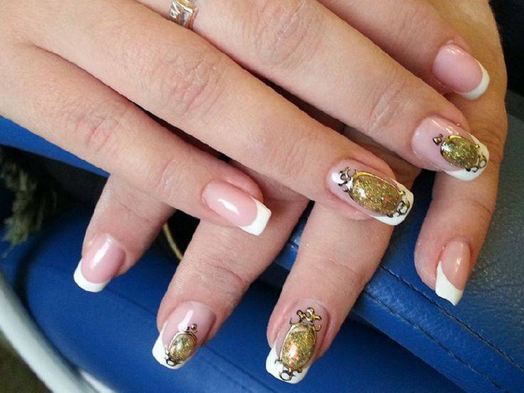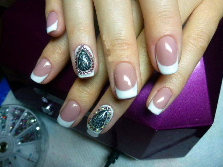 - Наиболее популярным методом красиво выложить стразы на ногтях, является вариант френч и двойной френч. Для такой схемы оптимально использовать небольшие элементы, а можно воспользоваться и замечательной хрустальной крошкой,