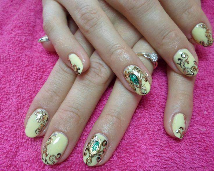 Самостоятельно можно выполнить также рисунок, включающий имитацию драгоценных камней. Сначала нужно создать контур камня. Для этого выбирается гель соответствующего цвета. Гелиевый контур может быть обозначен с помощью разных цветов, чтобы создать эффект солнечных бликов.