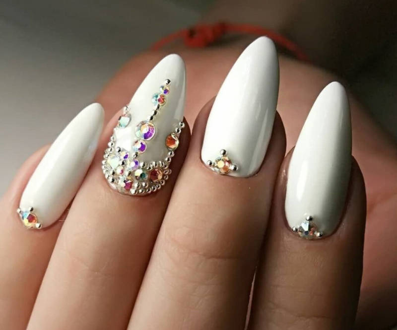 Большинство невест отдают предпочтение маникюру со стразами. Кристаллы могут украшать французский маникюр, однотонное покрытие или дополнять объёмную лепку, нежное кружево либо какой-то рисунок.