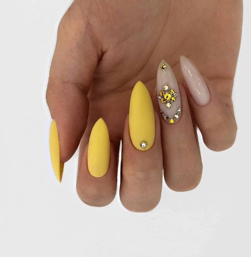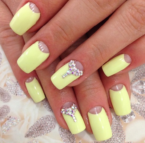 Желтый лунный маникюр, безымянный пальчик с прозрачными стразинками на границе лунного маникюра.