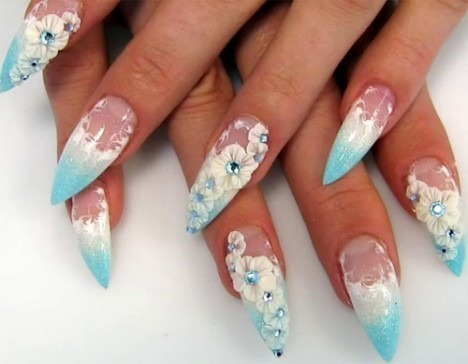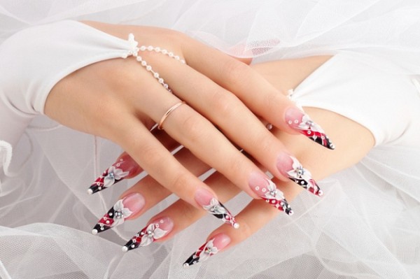 Чтобы прикрепить стразы к акриловой или гелевой поверхности, потребуется использование специального клея или же гель-лака, на непросохший слой которого или на не высохшее финишное покрытие крепится кристалл. После того, как вы высушите лак, можно еще один раз пройтись между камушками закрепителем. Многие стразы обладают конусообразной формой, для острого кончика которой, в наращенном ногте, просверливается дырочка, в которую и вставляется кристалл. Получается довольно прочный и оригинальный маникюр.