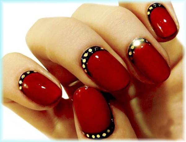 Красная основа ногтя, черная «улыбка» лунного маникюра и металлические стразы золотого цвета.