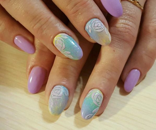 Миндальную форму можно также украсить флористическим принтом. Для этого на одном или двух ногтях рисуют несколько небольших или один крупный цветок. Так обычно выделяют средний и безымянный пальцы на обеих руках. Можно также украсить все пальцы мелкими цветочками. Очень красиво смотрится миндальный маникюр с трафаретными розочками, которые обычно делают с помощью лаков, относящихся к пастельной цветовой гамме. Это очень женственное и нежное сочетание, которое прекрасно дополняет такую форму.