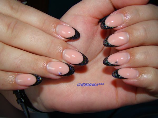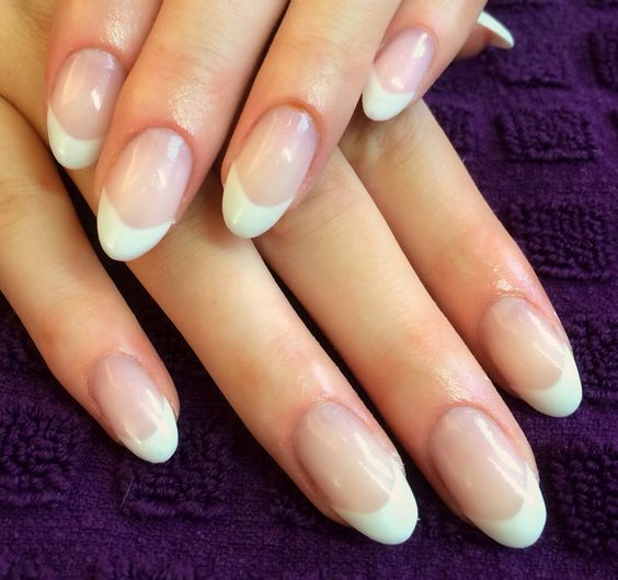 Очень нежно и женственно на миндальной форме ногтей смотрится французский маникюр. Обычно его делают на нежно-розовом, светло-бежевом или прозрачном базовом покрытии, причём в этом случае кончик ногтя можно будет покрыть абсолютно любым по цвету средством. Его можно сделать чёрным, бордовым или синим, но белый вариант является более спокойным и элегантным.