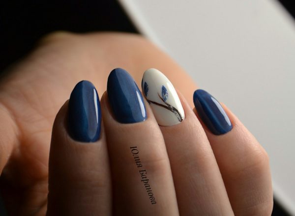 Наиболее популярный вид маникюра на длинные ногти – дизайн в морском стиле. Чтобы его создать, нужно покрыть пластину синим лаком, дать подсохнуть, наклеить 2 тонкие белые полоски. В уголке ноготка нарисовать маленькое сердечко, закрепить все при помощи прозрачного фиксатора.