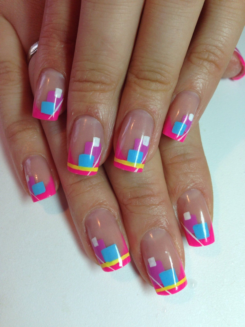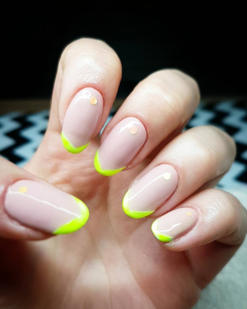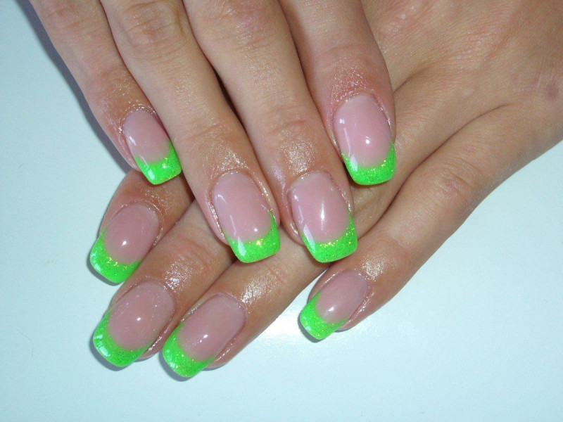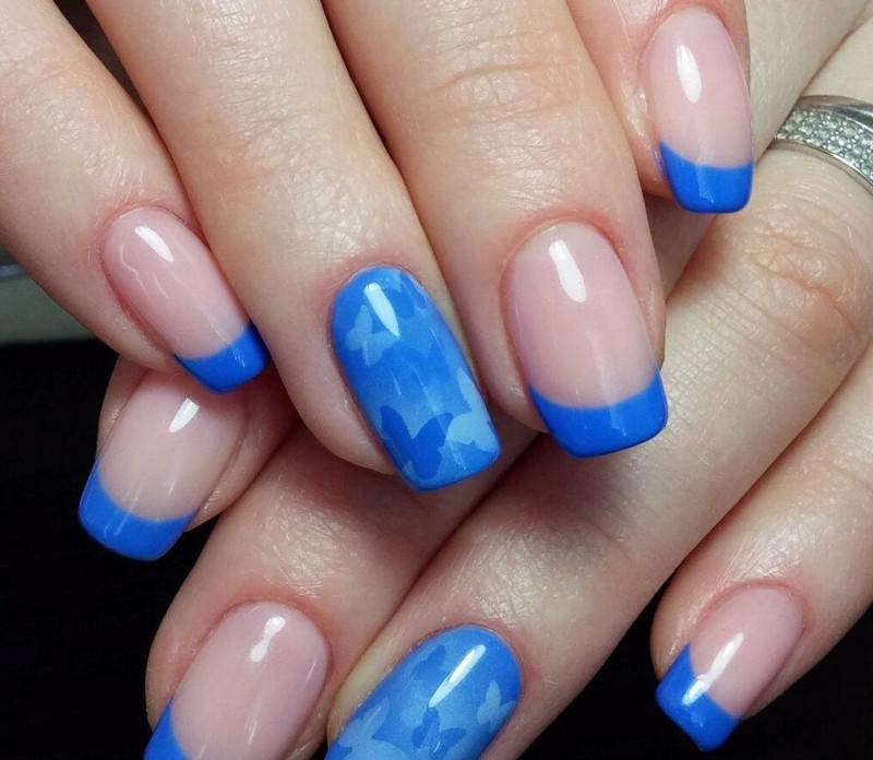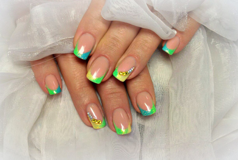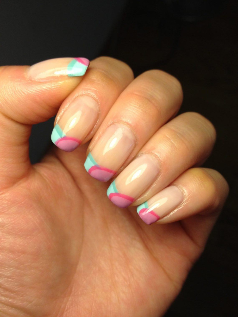 - – цветной френч: кончик ногтя окрашивается не белым лаком, а цветным;