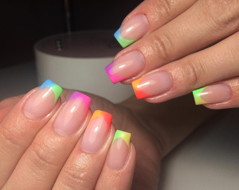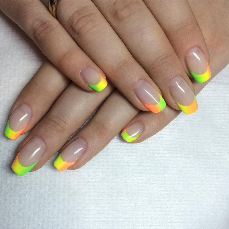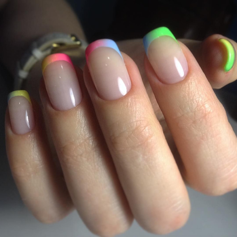 Градиент-френч отличается яркими и сочными красками. Такой дизайн можно сделать с помощью гель лаков или разноцветных гелей. Изящный перекат оттенков прекрасно сочетается с нюдовой камуфляжной подложкой. На каждом ногте можно сделать свой вариант перехода тонов.