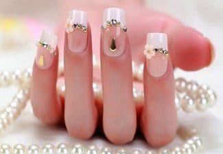 Для зрительного удлинения ногтей и придания френчу особого шарма можно дополнить маникюр узорами. Рисунки выбирают в виде цветка, ажурной линии, а также абстрактные узоры. При желании добавляют в дизайн стразы или бусины. Для этого в центр узора наносится небольшая капля прозрачного лака и крепится декор. Можно для надежности использовать специальный клей, на который крепятся искусственные ногти. Достаточно нанести рисунок на безымянный и большой палец. Тогда дизайн будет нежным и оригинальным одновременно.