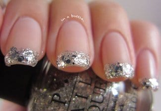 Блестки можно растянуть с помощью родной кисти или спонжа и получить сверкающий френч-градиент.