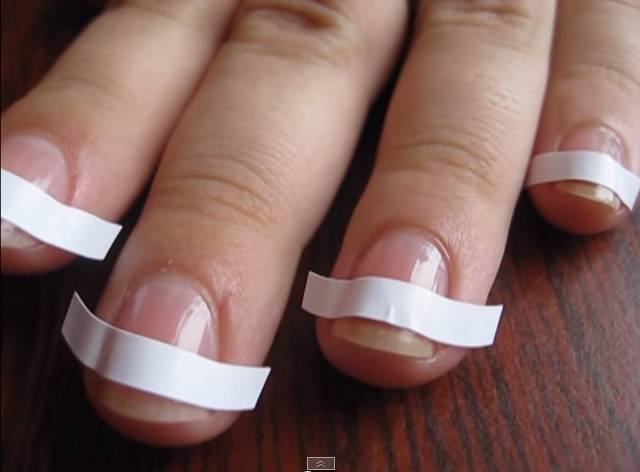 – наклейте полоски на другую руку, плотно прижмите их к ногтям по всей ширине, накрасьте ноготь выше полоски белой эмалью, дайте ей хорошо высохнуть и снимите трафареты;
