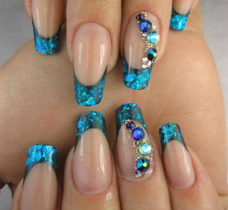 Прекрасный вариант для праздничного дизайна. Кончик ногтя можно заполнить плотными блестками или использовать мелкие частички специальной маникюрной пудры. Втирать их можно аппликатором для теней или пальцем.
