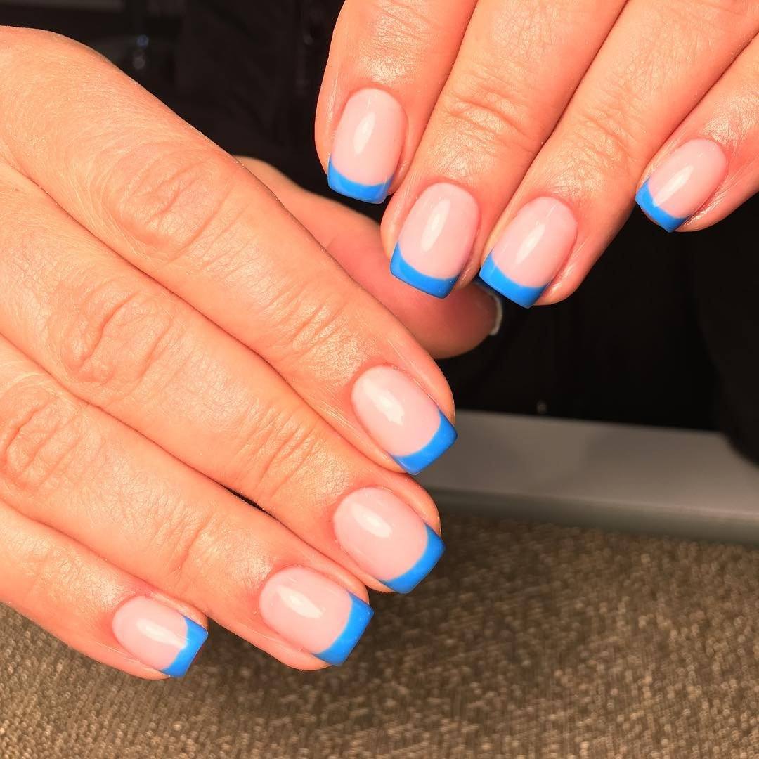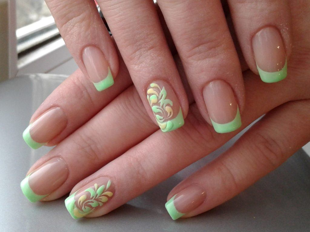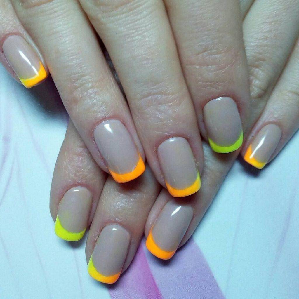 - – цветной френч: кончик ногтя окрашивается не белым лаком, а цветным;