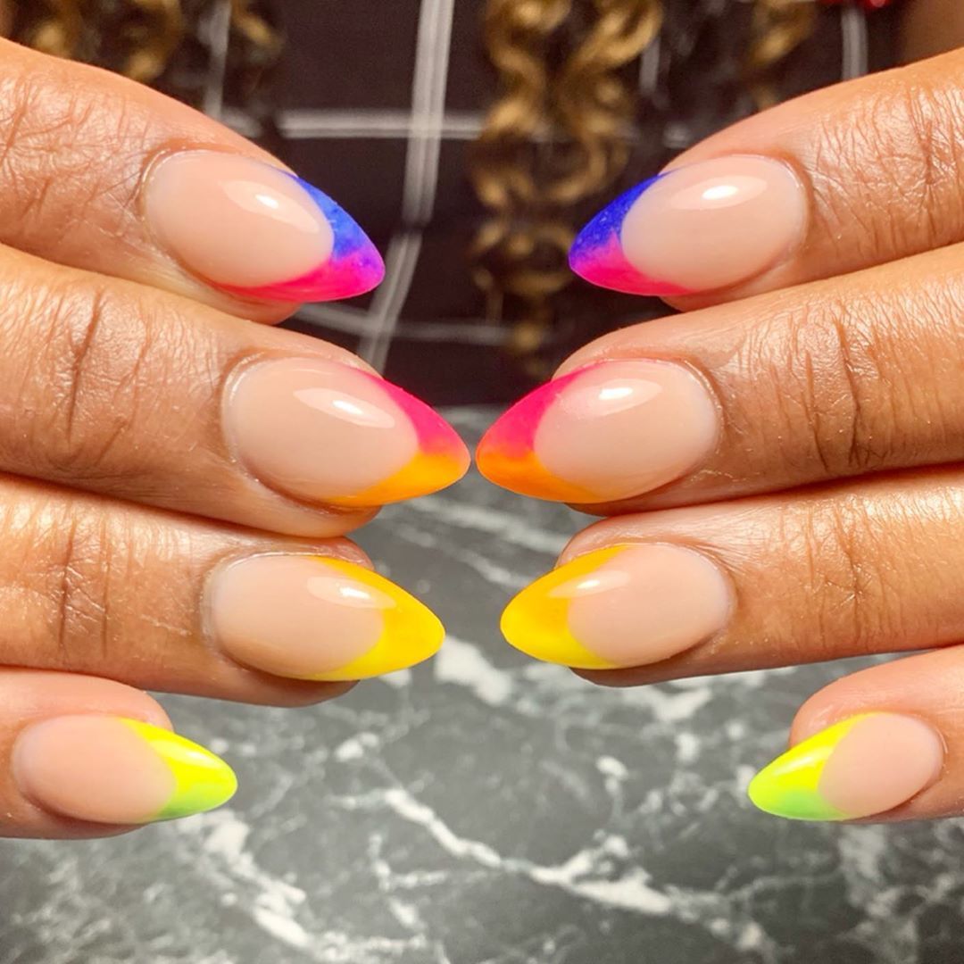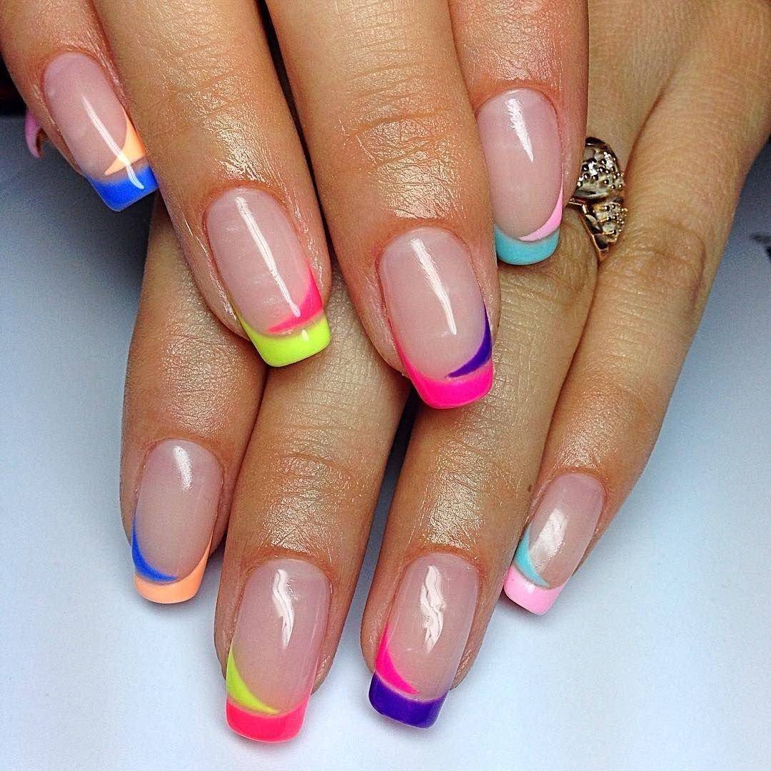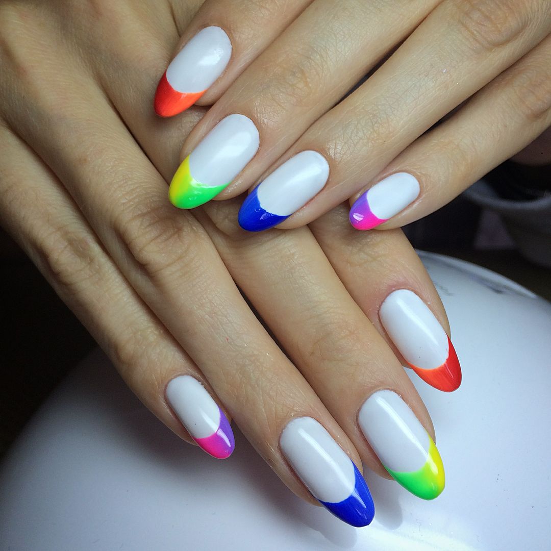 Градиент-френч отличается яркими и сочными красками. Такой дизайн можно сделать с помощью гель лаков или разноцветных гелей. Изящный перекат оттенков прекрасно сочетается с нюдовой камуфляжной подложкой. На каждом ногте можно сделать свой вариант перехода тонов.