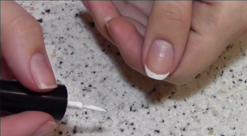 – закрасьте белой эмалью ноготь над линией и дайте эмали хорошо высохнуть;