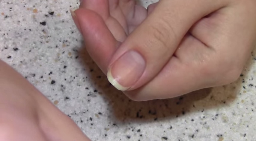 – тонкой кисточкой нарисуйте белой эмалью линию раздела между пальцем и отросшим ногтем;